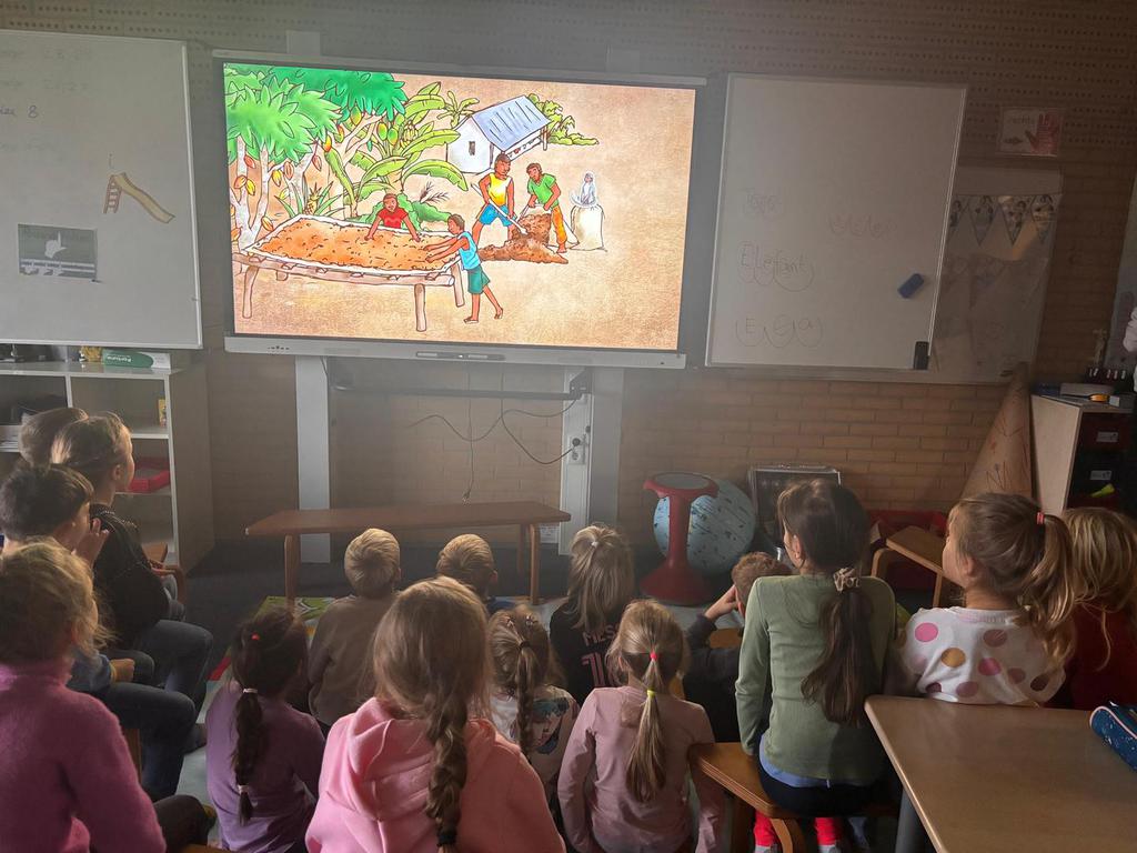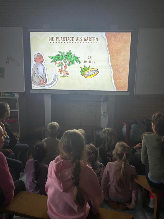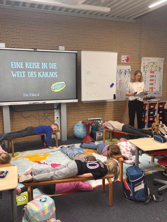 Am Freitag durften unsere Erstklässler an einem tollen Projekt des Arbeitskreises Eine Welt (Nordhorn) teilnehmen! Gemeinsam mit der Referentin Dilek gingen die Kinder auf eine Schoko‑Expedition zu Naki nach Ghana – und lernten dabei spielerisch, woher Kakao kommt, wie Schokolade entsteht und warum fairer Handel wichtig ist
