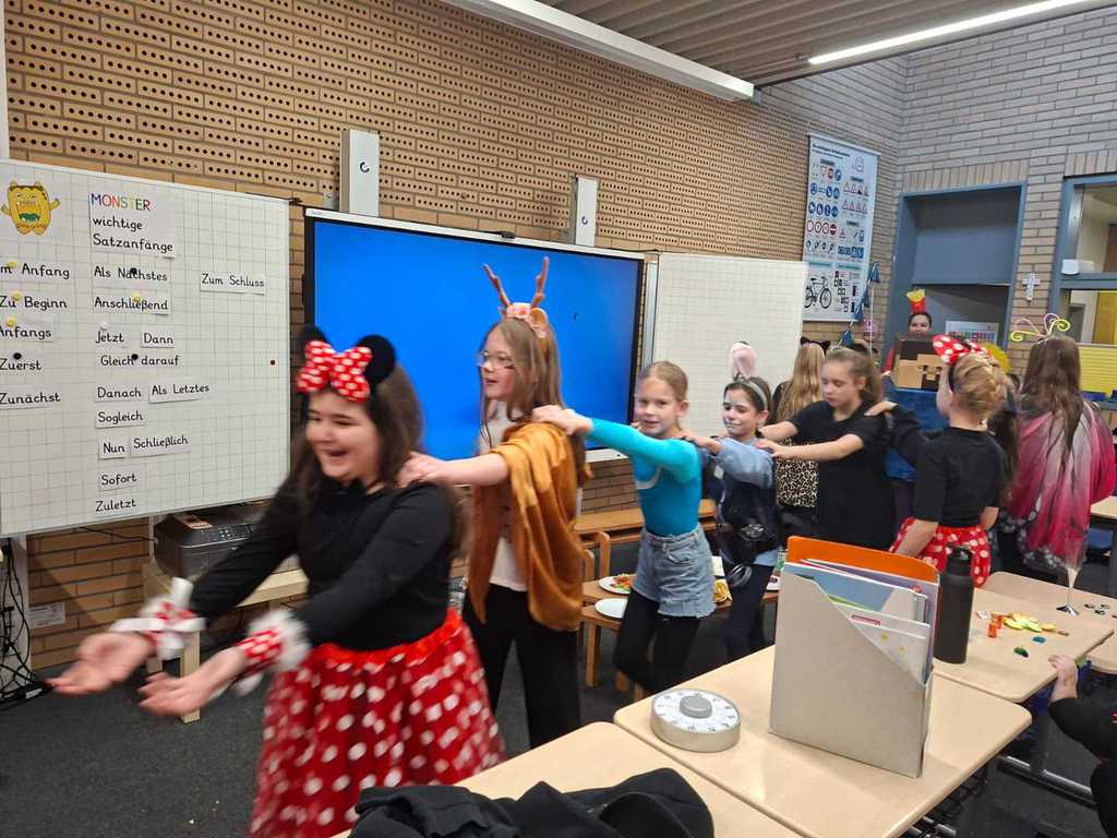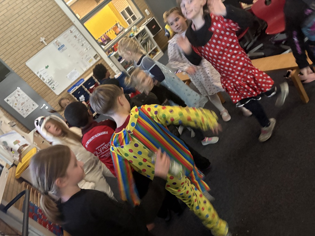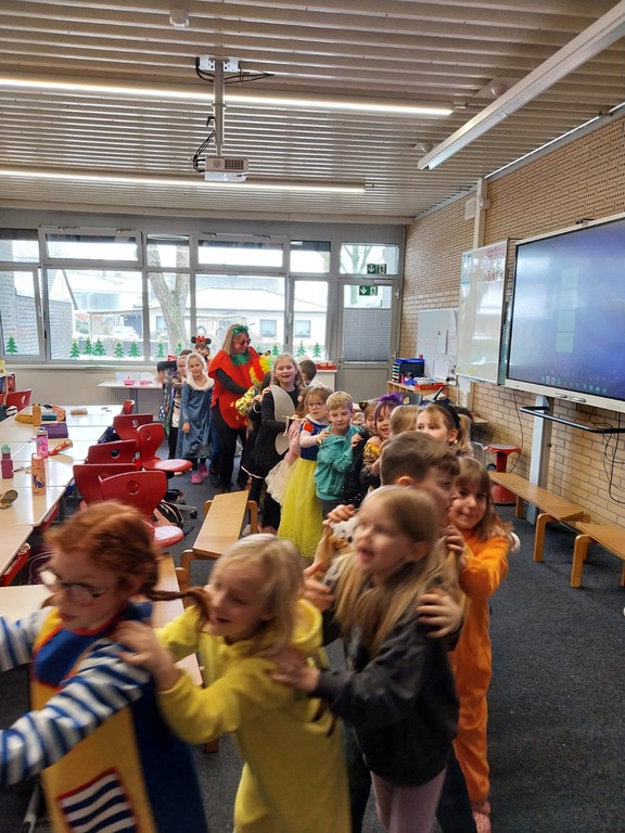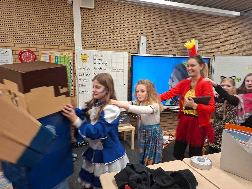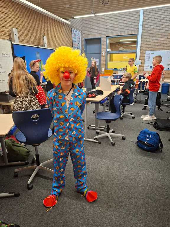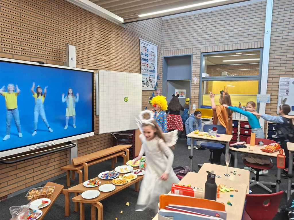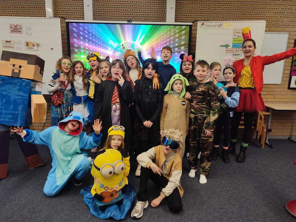 Heute geht es bei uns richtig bunt zu! Unsere Schule verwandelt sich in ein fröhliches Farbenmeer, denn wir feiern gemeinsam Karneval!